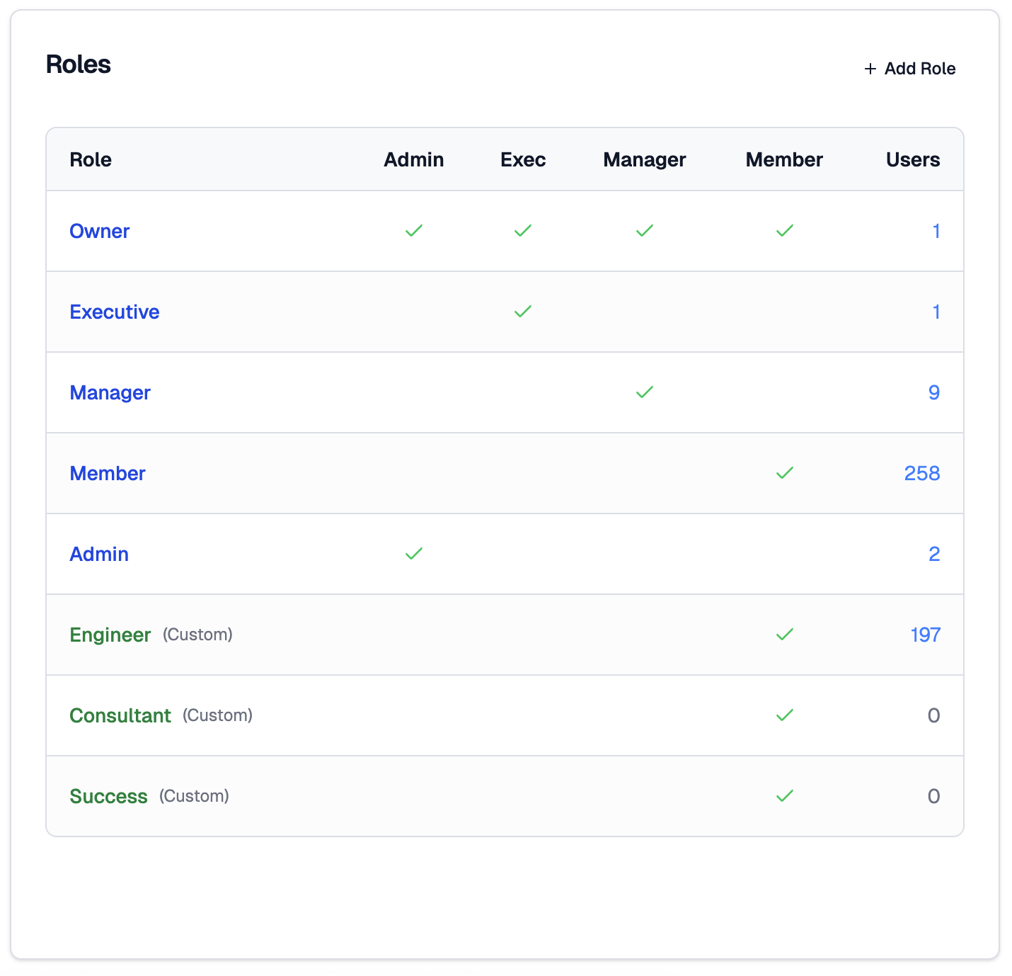 The number of users assigned to each role is shown on the right. Click a role name to view or edit its configuration.