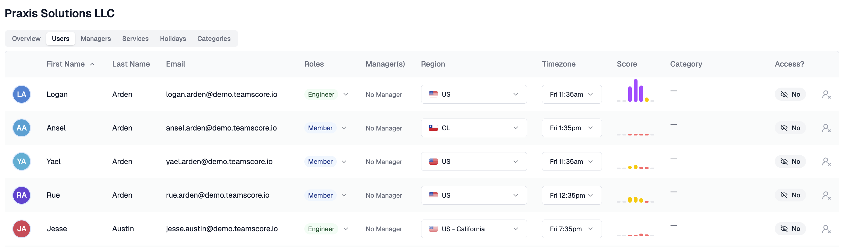 The Users tab shows everyone who belongs to this account. It mirrors the Team List but scoped specifically to this account. All the same inline editing is available here — roles, managers, regions, timezones, and categories can all be updated directly in the table.