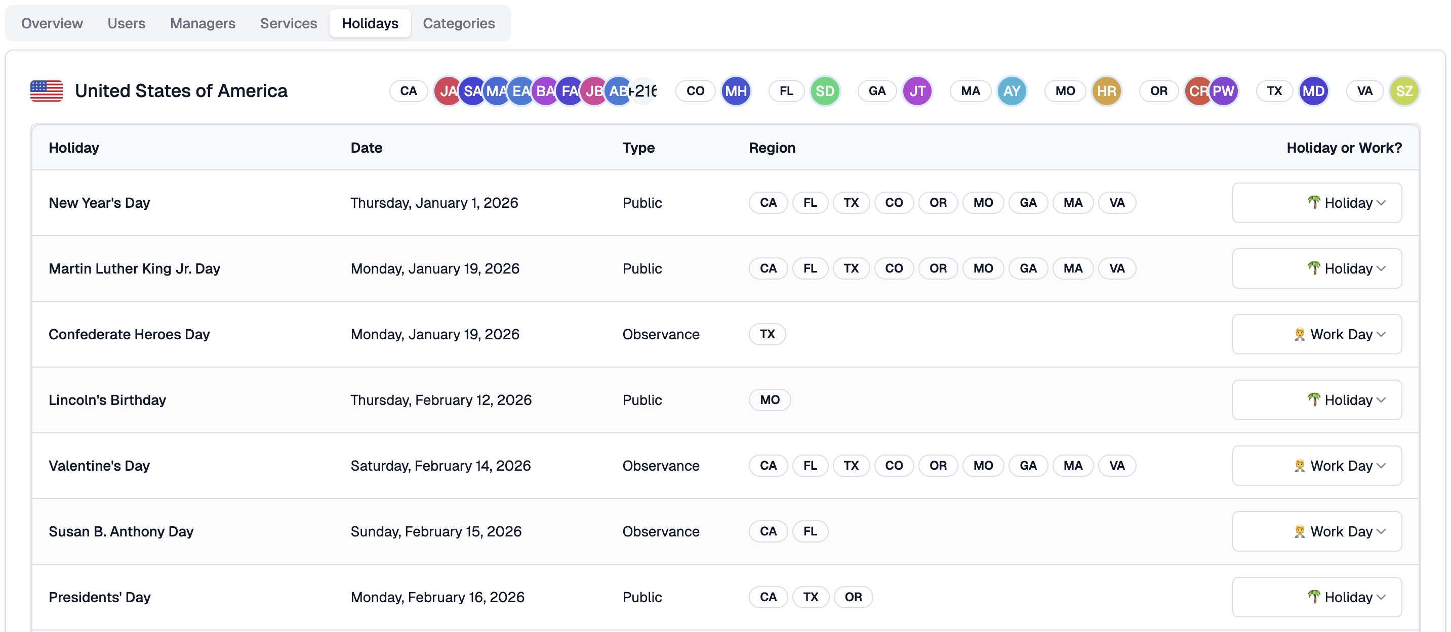 Each country or region appears as its own section, with user avatars indicating who falls under that location. The holiday table shows each holiday's name, date, type (Public or Observance), the regions it applies to, and a Holiday or Work? control.