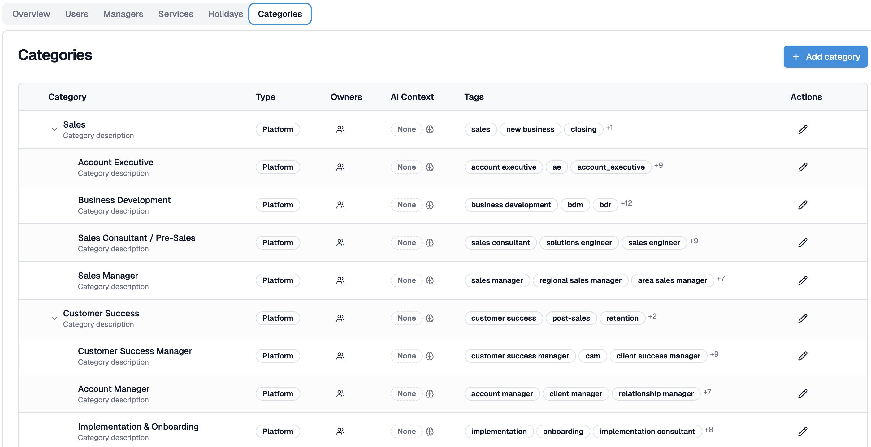 Actions — click the edit icon to modify a category's title, description, parent, tags, or AI Context.