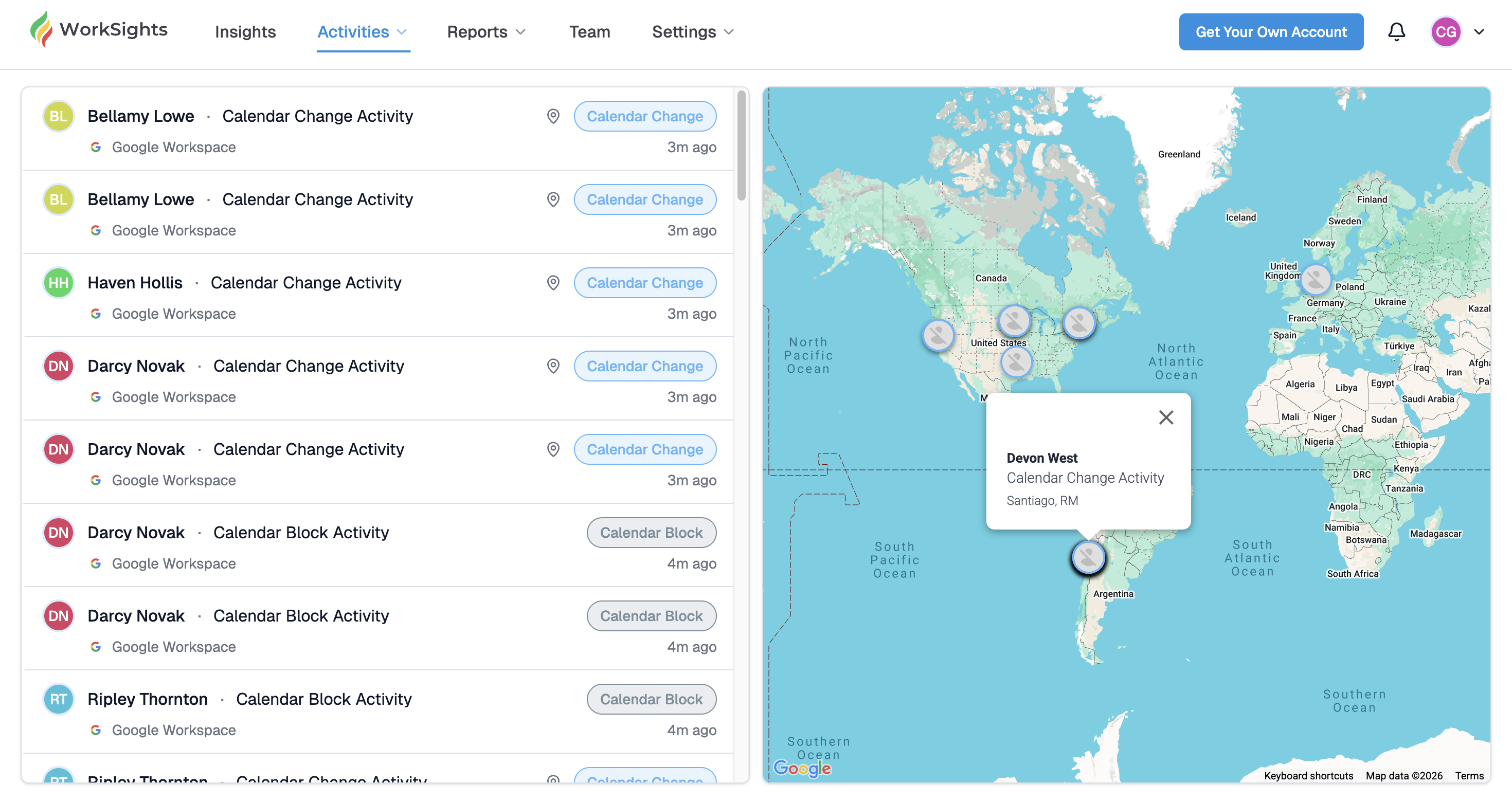 The Activity Stream gives you a live view of what your team is doing right now. As WorkSights processes activity from your connected services, new events appear at the top of the feed in real time. A map alongside the feed shows where those events are coming from.