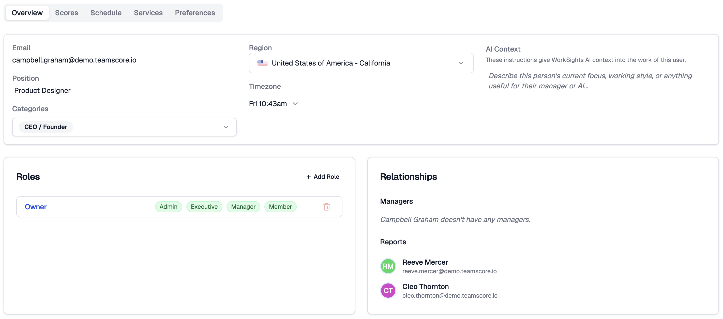 The Overview tab is the foundation of how WorkSights understands you. It brings together your identity, location settings, categories, roles, and reporting relationships.