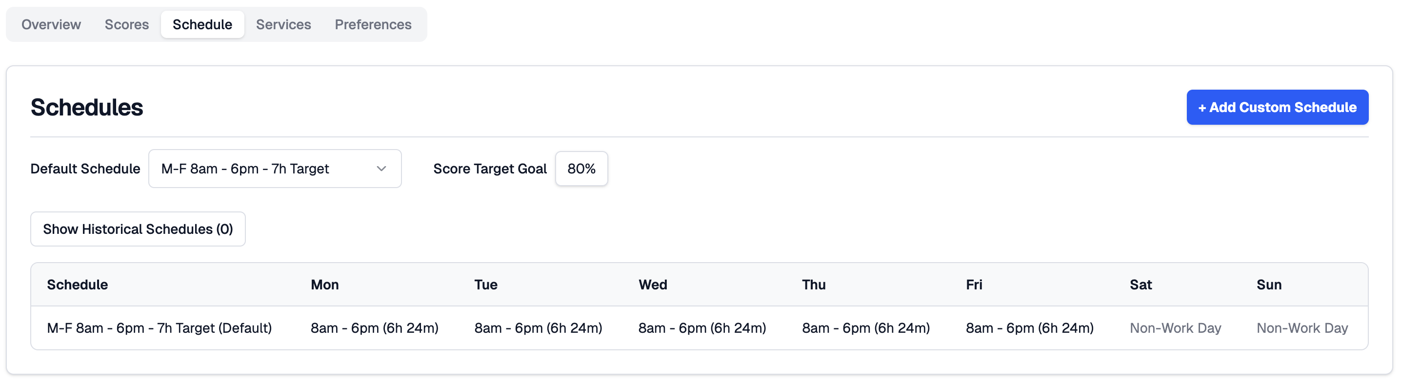 Your Default Schedule is shown at the top, along with your Score Target Goal — the percentage of scheduled hours you are expected to reach in a day. The default is 80%, which accounts for breaks, context switching, and offline work.