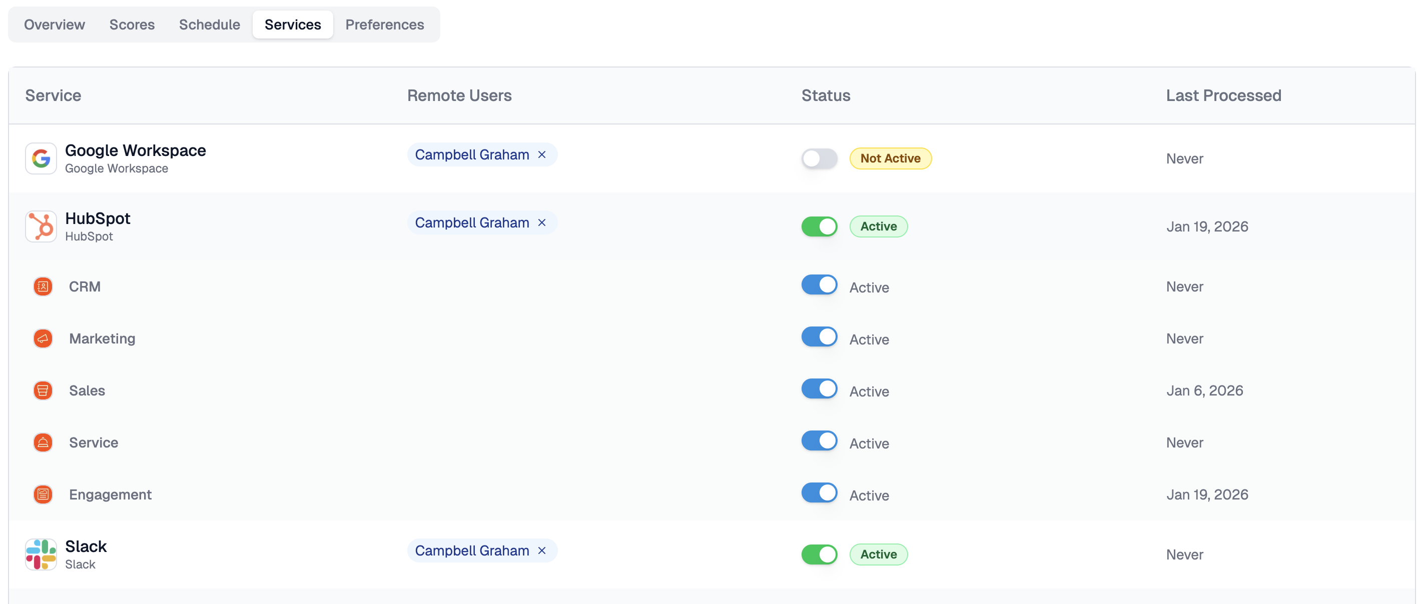 Sub-services — such as the individual HubSpot modules (CRM, Marketing, Sales, Service, Engagement) — appear below their parent service. Parent-level toggles control the entire integration; feature-level toggles control individual data streams.