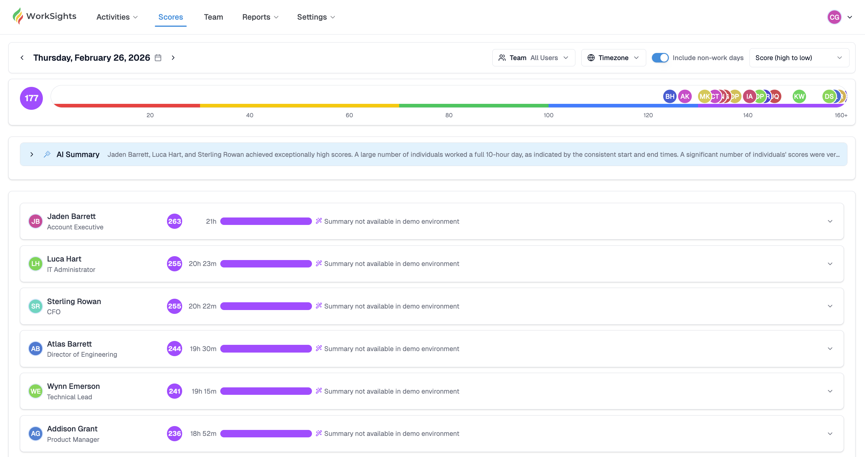Below the Team Score, WorkSights provides an AI Summary that highlights notable patterns for the day. This may include: