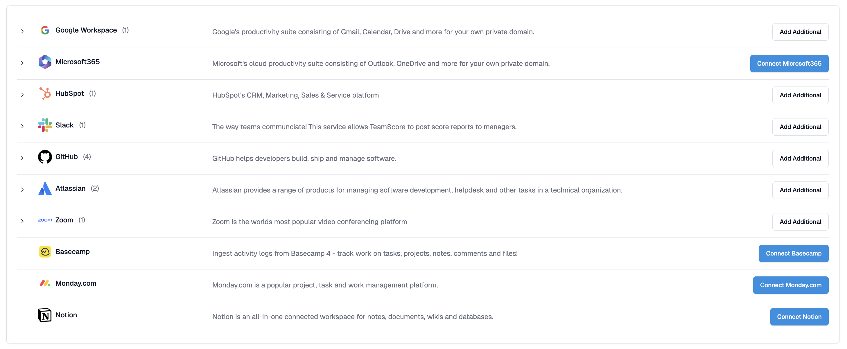 Click the Connect button for the service you want to add and complete the authorization flow with the provider. Only Admins and Executives can authorize new connections.