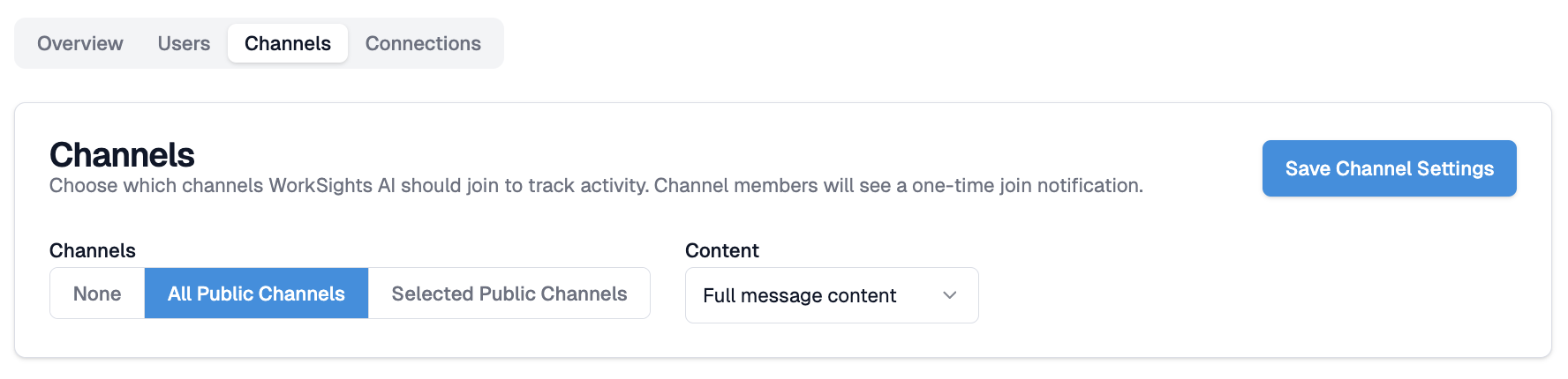 Open the Channels tab to control which channels WorkSights joins and what it ingests.